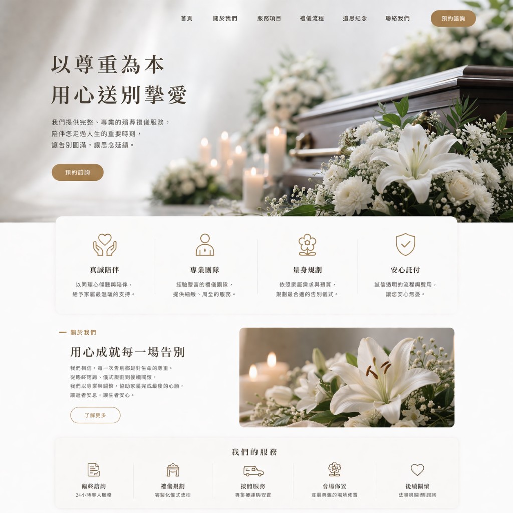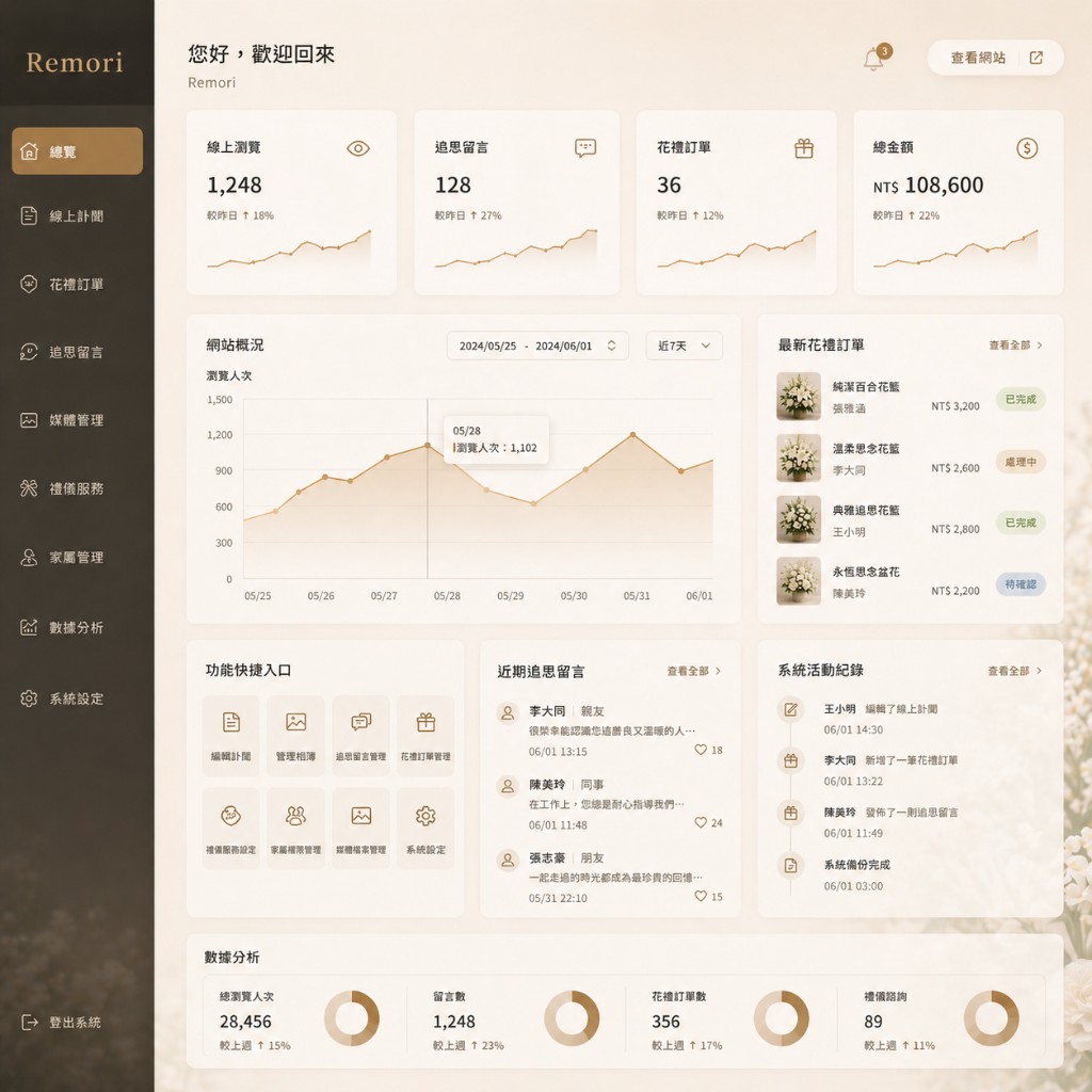 從數位訃聞到花禮管理,從後台系統到品牌官網,追思雲 Remori 一手包辦,讓您專注於最重要的事——陪伴每一個家庭。