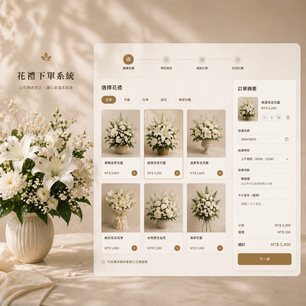 整合至訃聞頁面的線上花禮訂購功能,讓親友在致哀的同時,輕鬆選購花籃、花束,填寫致意文字,系統自動彙整所有訂單。