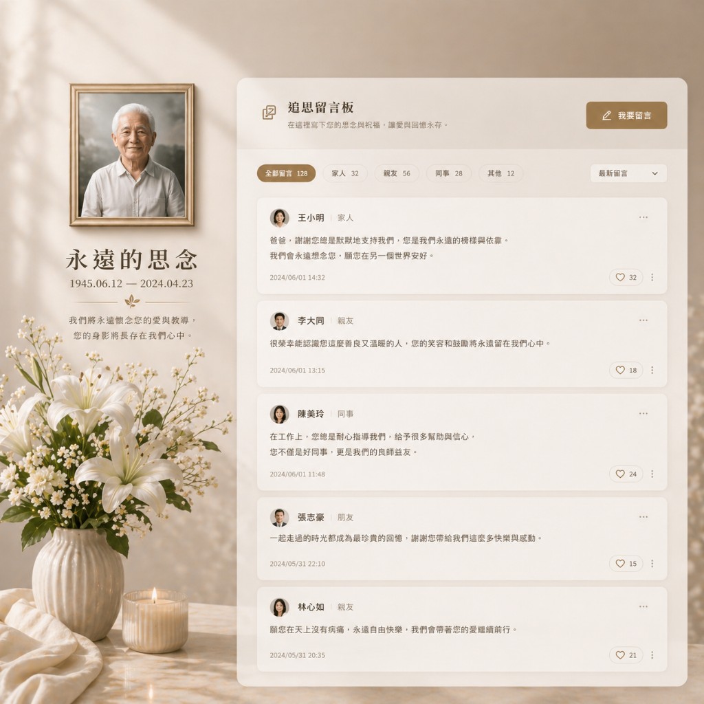 提供親友溫暖而有秩序的線上追思空間,隨時留下祝福與回憶。所有留言可分類管理,讓家屬與禮儀團隊更方便整理與保存。